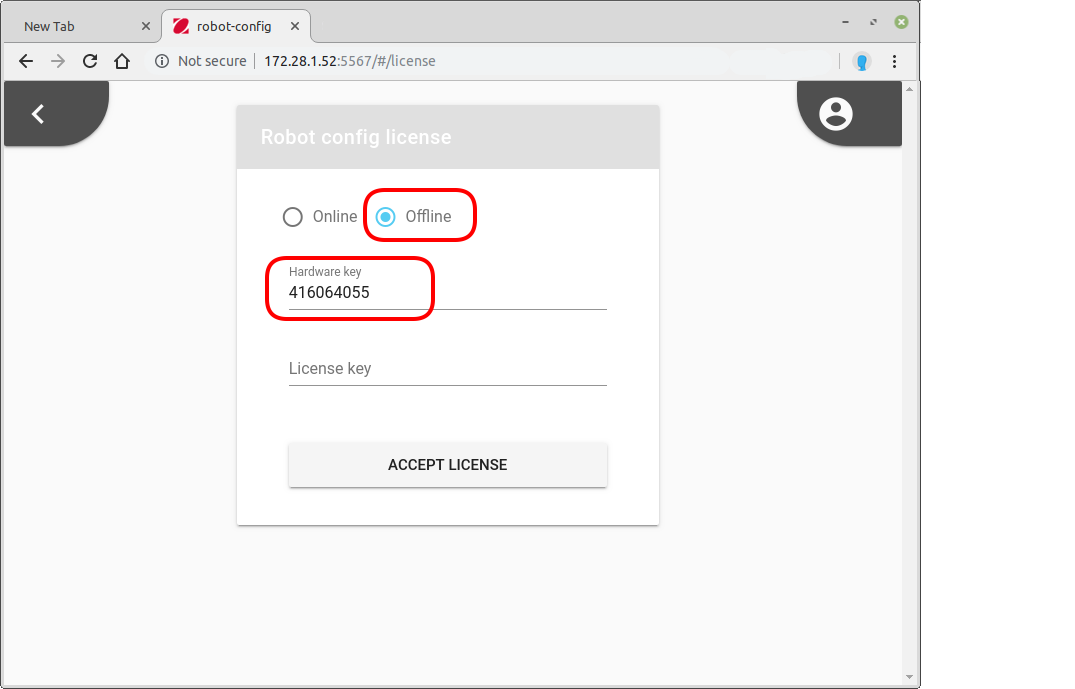 In Robot-Config click User icon in top-right corner, then select 'LICENSE', it will open license form: